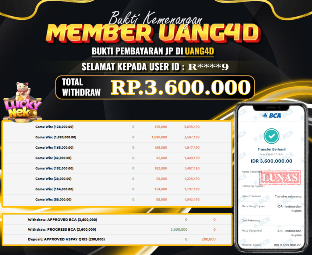 UANG4D– JACKPOT SLOT GACOR LUCKY NEKO 24 APRIL 2025, Jackpot Slot, Kemenangan Slot, Bukti Kemenangan Slot, Kemenangan Slot Pragmatic Play, Menang Slot online, Slot Gacor, Situs Aman Terpercaya, WD Berapapun Pasti DI Bayar Tuntas, Maxwin Slot Online.