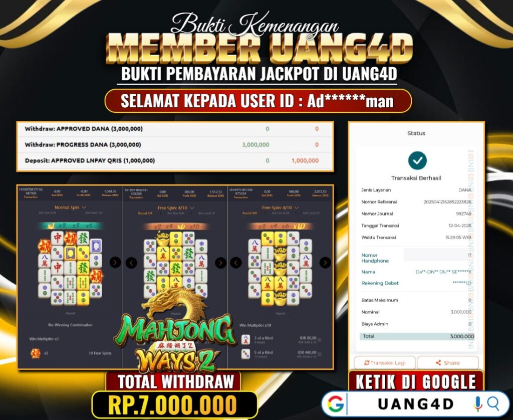 UANG4D –JACKPOT SLOT MAHJONG WAYS-2 12 APRIL 2025 , Kemenangan Slot, Bukti Kemenangan Slot, Kemenangan Slot PG Soft, Menang Slot online, Slot Gacor, Situs Aman Terpercaya, Withdraw Berapapun Pasti DI Bayar Tuntas, Maxwin Slot Online.