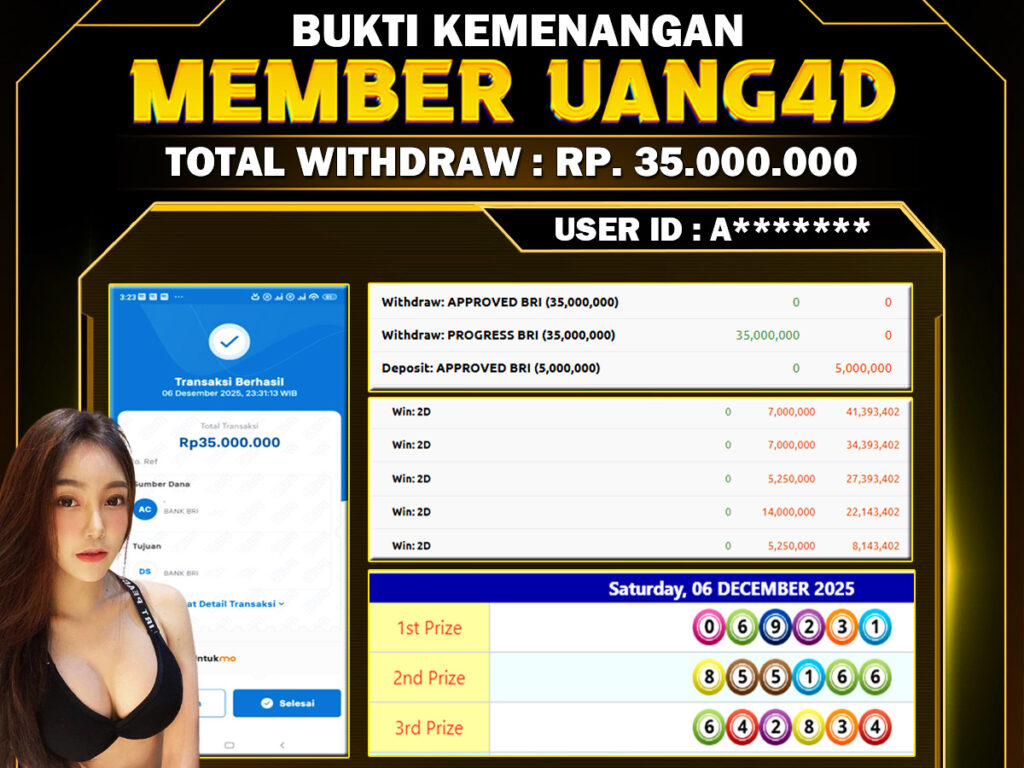 Setiap hari, member UANG4D berhasil meraih jackpot besar dari berbagai provider togel ternama yang kami sediakan, seperti Sydney, Singapore, Hongkong dan masih banyak lagi. Kami secara rutin menampilkan bukti screenshot atau rekapan kemenangan yang berhasil diraih, mulai dari kemenangan ratusan ribu hingga puluhan juta rupiah. Semua slip kemenangan ini kami hadirkan untuk membuktikan bahwa di UANG4D, peluang menang itu nyata.